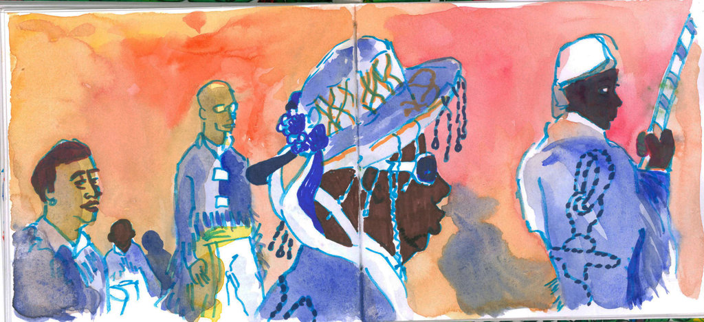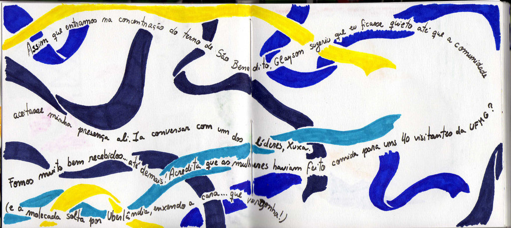 At the moment I just finished a 40-page visual diary, based on the memories I have from a 48 hours experience with the Congado festival (an African-based festival, very colorful) at Uberlandia, Minas Gerais. This journal I sent to Naples. My future projects consist of organizing projects for traveling journals, aiming to publishing them in a book format.