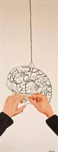 Her current Brain Series deconstructs familiar themes related to how our brains function. This Series presents opportunities for scientific learning and conceptual visual challenges. The painting “Don’t You Remember?” shows the concept of the brain and memory with the brain painted as wire. “Present, Past, Future or Dreaming” uses rubix cubes to represent how our minds are in flux, but being present is where the brain, your mind, is of most use or at its near full potential.