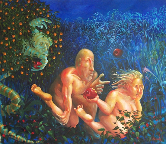 I just finished a painting that is on display at the Museum of Florida Art from 11 November thru 4 March 2012 called Adam Naming the Animals and the Appearance of Eve. I designed it in a way to be a reflection of our contemporary culture, in that all of the birds and animals were chosen as the result of a Facebook poll. I asked people to vote for whatever animal they would like to see in the painting, and received a very long list of creatures. Some of them I had never heard of, such as the Philippine tarsier, and other animals I knew personally.