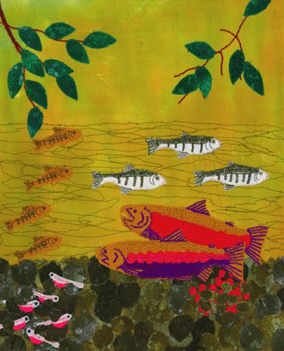 The layering and textures in my artwork reflect the qualities and characteristics of the sensitive habitats in which I work. The appliqué and stitching suggest layering that occurs, such as the stratification found within a forest community or the inter-tidal zones that make up a marine environment. The materials I use to make my art, come from the forests and the fields, repurposed into the thread used to make the warp and weft of my woven canvases.