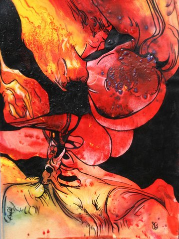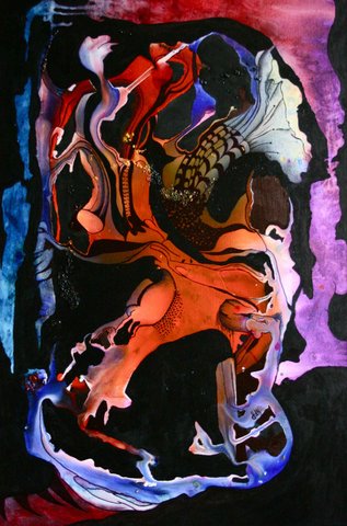 Since my work is an emotional response to my experiences, I use vibrant colours and apply my paint vigorously to create a sense of energy and capture emotion and sometimes I add various suggested forms using pen and ink.