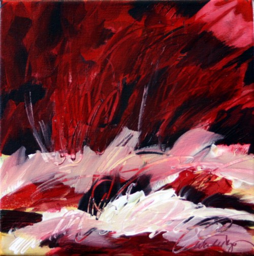 I start by applying color to the canvas and see what happens, I respond with more color or texture, watch, react, paint some more, respond. This is a lot like jazz; listening, reacting and playing simultaneously.