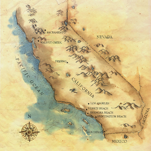 After earning a BA in illustration from Harrow College of Art near London in the UK, I spent a few years in New York City painting background scenery for animation and film. At the same time as I was painting watercolor backgrounds for the Beavis and Butthead movie, I discovered the pleasures of vicarious travel through map making and started making illustrated maps for various publishers.