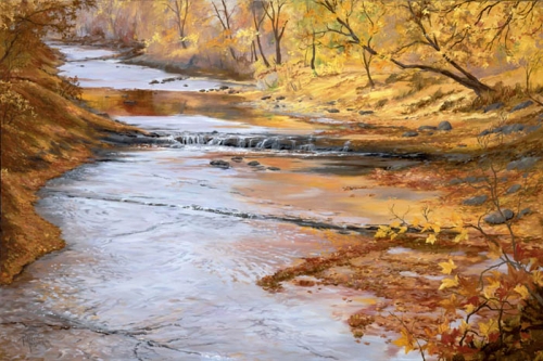The dynamic coast of California, where I live now near Laguna Beach, has also been a favorite subject matter for paintings. Water in all its forms, from the calm aqua Caribbean, the crashing cobalt blue Pacific, to tumbling rivers of every size, there is a mesmerizing quality it holds that I never tire of painting.