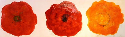 “Three Poppies” Acrylic and mixed media on board, 24″ x 80″