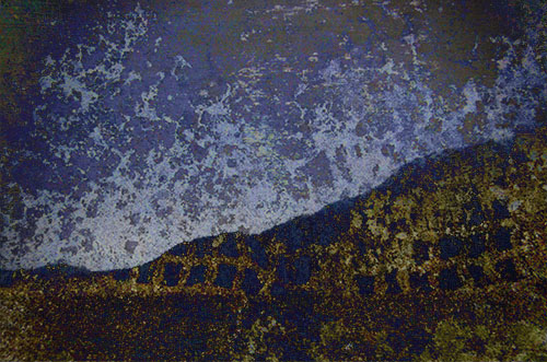Weathered textures stand in as historical reference, and help her explore abstraction to reach a more recognizable concept, even as the details are glazed over. As a whole, the work explores the memory of landscape and the journey through place and time.